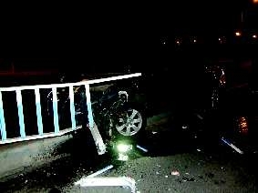 22时许,在观海路迟家路口处,于某驾驶一辆别克小型轿车沿观海路由南向北,为躲避顺向车辆,自己的车先撞在路中的护栏上,后穿过水泥墩,驶入对向车道,造成自己的车辆受损,护栏损坏6米左右。