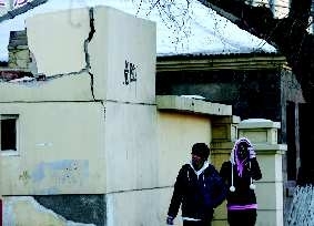 13日,在烟台市区大马路,两位市民从一处残垣断壁下走过。不少路过的市民都是走到墙下才看到“危险”俩字。一位市民告诉记者,业主明知危险,为什么还要留着这堵墙呢?本报记者赵金阳 摄影报道