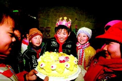 13日中午,临沂市爱心1+1车队的庄万里师傅把本报爱心地产圆梦行动小组带到了蒙阴县岱崮镇中心小学。得知记者一行给他带来了生日蛋糕,娄成伟显得格外开心。