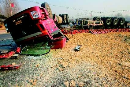 13日上午10点,记者在汶泗路与205国道交会路口看到,一辆大货车底朝天“躺”在路上。据了解,当日凌晨4时大货车行至此处,为躲避车辆急打方向盘,导致翻车,车厢内的石英砂全部散落在地,所幸并无人员伤亡。