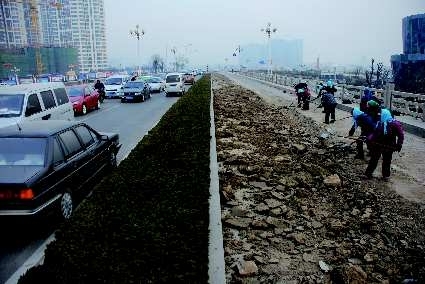 在现场记者看到,临沂市园林局滨河景区涑河管理所和枋河管理所的工作人员正在清理渣土。“潮湿的渣土一掉到地上很快就结冰,很难清扫。”枋河管理所所长王勇告诉记者,早上6点半左右,工作人员巡逻的时候发现了路面上的建筑渣土,他们立即调集了60多名工作人员到现场清理。