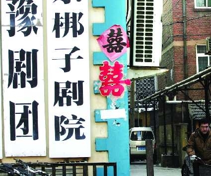 在一家装修现代的大型酒店前门西墙,三个硕大的木牌在寒风中发出沉闷的砰砰声。写有“济宁市豫剧团”的木牌就悬挂在中间。木牌西邻的一条狭长胡同看不到尽头,停放着的两三辆崭新的轿车,映衬着两侧的几栋红砖楼房越发陈旧。