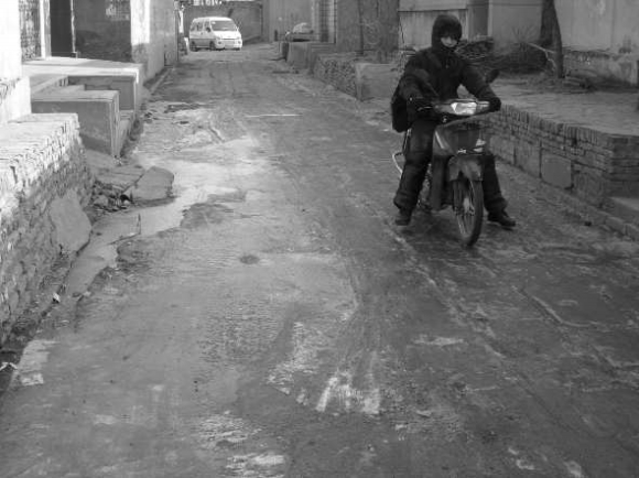 居民董先生告诉记者,结冰路面对居民生活造成了很大麻烦,平时骑车从这里经过时,一不小心就会摔一跤,“走在路面上就像上了滑冰场。”对于结冰原因,董先生说,是居民把生活用水排到路面上造成的。