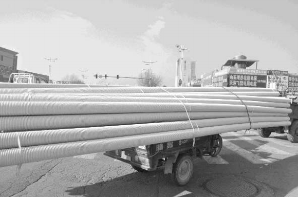 12日中午,在建设路,一辆满载塑料管的机动三轮车前后均超长两米多,几乎是两个三轮车的车长。巡逻交警根据相关规定,对驾驶员处以100元罚款、扣1分的处理。 本报记者 李怀磊 通讯员 温静敏 摄