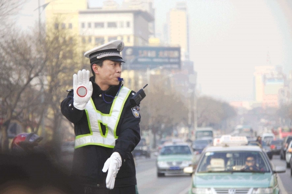 1月13日,在“1·04”案件中受伤的两位民警刘峰和赵伟,出院后第二天就上岗执勤。图为在东岳大街青年路路口,民警赵伟正在指挥交通。