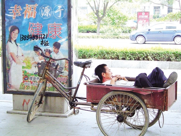 自述:路边的树荫下,一市民睡在三轮车里。