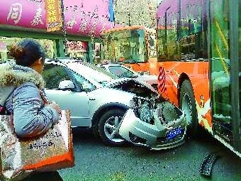 13日下午一点多,在辽宁路与道口路交界处,一辆正在行驶的320路公交车与从道口路驶出的一辆私家车相撞,私家车车头损坏严重,事故发生后,在等待处理的近一个小时内,辽宁路上十多辆2路电车被挡住,造成较为严重的交通堵塞。本报记者 刘玉彩 摄影报道