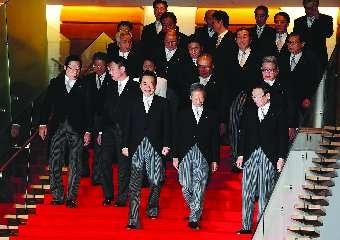 1月14日,在日本首都东京首相官邸,新内阁成员从台阶走下,准备合影。
