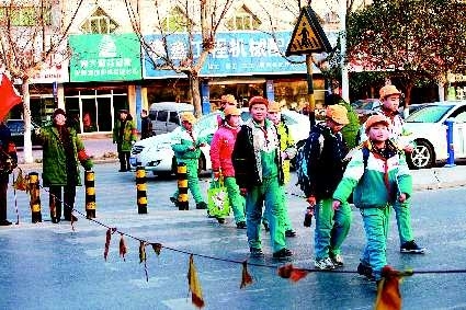 “我们每天上午11点会准时来到这里,直到12点多学生走完后才回家;下午4点半过来,5点半左右结束,每天都这样。”盖洪彩老人笑着说。“今年冬天冷得厉害,最冷的时候有零下10度,穿上厚厚的棉袄棉鞋,还是冻得直打哆嗦,你看我的脸都冻肿了。”盖洪彩指着脸上的冻疮告诉记者,自己身体上受点罪倒没什么,最让人气愤的是,以前有司机对他们的行为不理解,有的甚至还骂他们妨碍自己过路。