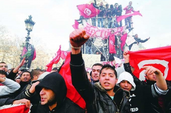 当地时间1月15日,法国巴黎的突尼斯移民走上街头示威,庆祝本·阿里下台。 CFP供图