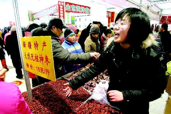 1月15日,2011年春节民俗年货展销会在烟台火车站东大厅举办,地方特产、各色年货以优惠的价格吸引了不少市民前往选购。据了解,年货会仅第一天就收入30万元,16日截至下午4时,已经入账40万元。
