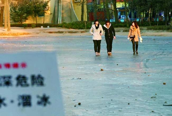16日,在中山公园小西湖,三名女孩在结冰的湖面上玩耍。据了解,近日岛城气温连续走低,16日岛城市区的最低气温为-10.4℃,郊区更是低至-16.2℃,是岛城的气温最低值。青岛前海一线、公园的游客都非常少,市民在游玩时还要注意安全。 本报记者 杨宁 摄