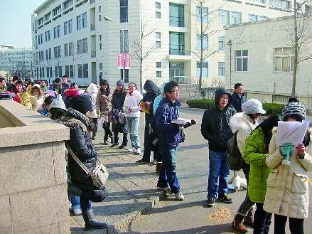 15日,2011年考研的第一天,岛城的2.5万名考生分别赴26个考点赶考。该日岛城的最低温度在-9℃,寒冷的天丝毫没有影响考生的热情。15日上午7点30分,记者赶到青岛第十七中学。虽然离考试还有一个小时,可考场外已经排起了两列长队。记者看到,门外等候的考生都裹得很严实,不少考生争分夺秒,等候时间都拿着课本在复习。 “我在附近租了一个旅馆,10分钟就走到了。”排队等候的考生亓文静说。小亓是海洋大学青岛学院工商管理的学生,这次考研她报考了上海大学的国际贸易专业。“上午考政治,考前再回顾一些知识点还是有用的。”小亓笑着说。 由于天气太冷,又刮着刺骨的寒风,排队的考生不停地跳着活动。8点,考生将准备好的身份证、准考证等证件拿到手中,等待检查陆续进入考场。