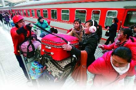 本报1月16日讯(记者 赵波) 行李最多,笑声最大,人数也是最多,16日下午,在青岛火车站的南候车室,最显眼的当数在候车室中央的一群年轻小姑娘了,她们是从新汶川来山东培训的,一共51个人,在山东经历了两个月的“学艺”,下午4点15分她们踏上了回家的路(上图)。 下午3时,记者在火车站的南候车室看到,在候车室的中央,一群20岁左右的小姑娘有说有笑,几乎将中间的一排座椅全部坐满,行李包堆在走廊上,占据了大半个走廊。 “我们四点一刻的火车,现在就快开了。”一位叫肖红的女孩带着笑容说,她们是四川新北川市永昌镇一家电子科技厂的工人,是来山东学习的,一共51个人。今天早上从烟台乘坐公司提供的大巴车到青岛,由于单位早就给订了K208次火车的车票,她们相对就显得特别轻松。