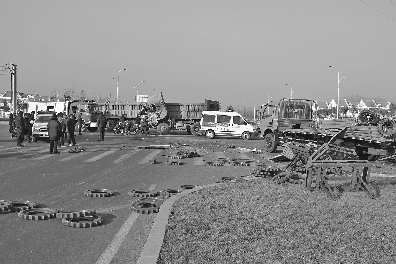 消防官兵赶到现场后看到,一辆蓝色拖挂货车横在路口西南侧,车头向右后方扭转了近180度,驾驶室变形严重,被撞得支离破碎,附近散落着车内杂物和破碎的零件。与拖挂货车相距20米外,一辆绿色的卡车车头朝北,拖挂货车的挡风玻璃躺在卡车前面,卡车的右侧车厢深深凹陷下去,车上运载的钢制齿轮和铁架等货物抛撒在卡车的左后侧,所幸驾驶室内人员安然无恙。
