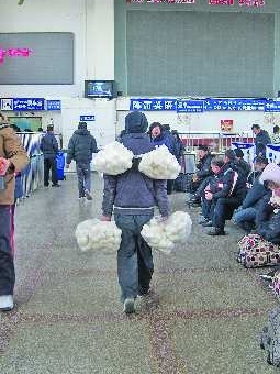 16日,一位年轻小伙左右手各拎着三袋白馒头,左右肩上也各搭了两袋,向火车站走去,引起不少乘客的关注和好奇。小伙告诉记者,馒头是给火车上送的,总共有10袋400个馒头。春运来临,火车上对馒头的需求也比平常要多了很多。 本报记者 李继远 王宗吉 摄影报道
