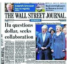 《华尔街日报》头版头条标题:胡锦涛质疑美元寻求合作。