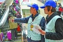 大学生志愿者在济南火车站候车大厅服务。 记者 赵伟 摄