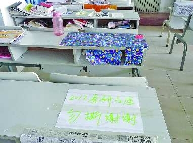 本报1月19日讯(实习生 任辉 记者 李飞) “众多课桌上赫然贴着‘2012考研占座’字条。”记者采访了解到,2011年研究生考试刚刚结束,省城不少高校的自习室就被一抢而空。 山东大学2008级新闻系的曹竹青同学准备参加2012年的研究生考试。1月16日,2011年研究生考试刚刚结束,当晚,她和同学去学校理综楼自习室占座,却发现平时用于考研复习的自习室大都已被人“捷足先登”。“五楼考研自习室大部分桌上都贴着写有‘2012考研占座’字样的纸条。”曹竹青说,那些复习资料都是刚参加完研究生考试的同学的,原以为考研结束当天来占座已经很早了,没想到有人比她更早。最后她在六楼一间自习室找到了一个座位。 “2012考研占位,请勿扰,谢谢。”17日下午,记者在山东大学理综楼看到,从三楼到六楼所有平时用于考研复习的自习室都基本上被占满了,虽然教室里学习的同学并不多,但每张桌上几乎都写着类似的“考研占座”字条。“15日晚,考研第一天刚结束,我就去理综楼考研自习室占了一个座。”文学与新闻传播学院2008级的葛云飞说,由于就业压力大,现在考研的同学非常多,竞争很激烈,只好想办法提前占座。 记者从省城多所高校了解到,虽然2011年研究生考试刚刚结束,但2012年考研备战已经打响,学校的自习室在很短的时间内被占满。采访中,一些没有占到座的同学都很无奈。他们表示现在学校里用于复习的自习室本来就有限,现在就业压力的增大,使不少人选择继续考研,这更加剧了自习室的紧张。
