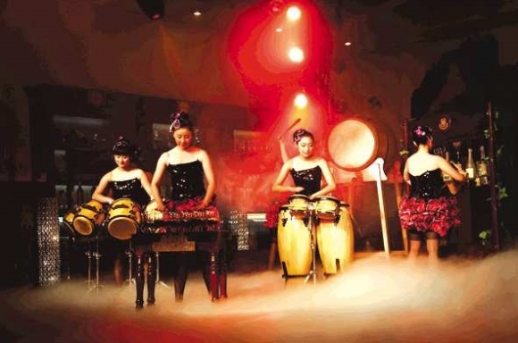 由张裕酒城首创的葡萄酒主题乐器组合,是选用葡萄酒生产工具及器皿制成,由橡木桶大鼓、架子鼓、康佳鼓、慢波鼓、酒杯琴、酒瓶琴等组成。将橡木桶制的鼓类乐器的高亢浑厚、酒杯杯缘摩擦出的回绕天籁之音及酒瓶敲击出的清脆动人的乐音与拉丁舞舞者传递出的艺术表现力完美融合,将烟台的葡萄酒风情展现得淋漓尽致。