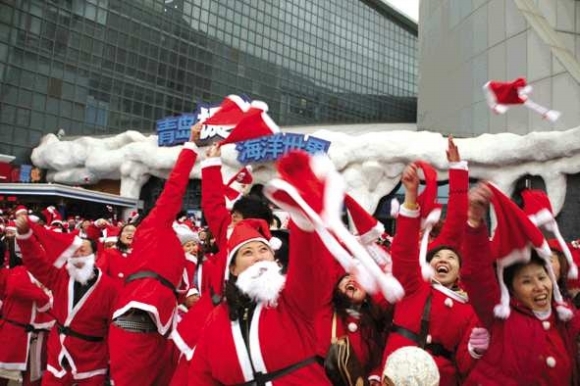 青岛极地海洋世界面向社会征集了2011位圣诞老人,在“2011好客山东贺年会”正式启动前进行预热。参加此次活动的圣诞老人欢聚在青岛极地海洋世界广场上,一起摆出2011字样,以此来迎接新年,并向全省及全国人民送去新一年的美好祈愿。