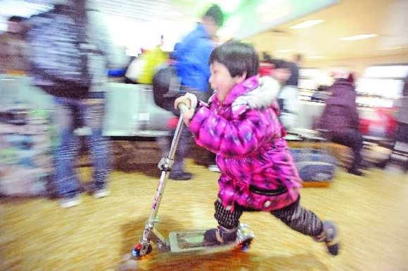 17日,济南火车站,5岁的彭燕在拥挤的候车室里快乐地滑着滑板车。快到上学年龄了,一直跟妈妈在外漂泊的小彭燕节后将留在老家,所以她带上了平日最喜爱的滑板车同行,开始她的新生活。 本报记者 张中 摄
