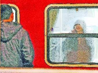 16日晚,一对情侣在济南火车站依依分别。一个在车厢里,一个在站台上,他们通过手机互道告别。一窗之隔挡不住他们心中爱的脚步。 本报记者 邱志强 摄
