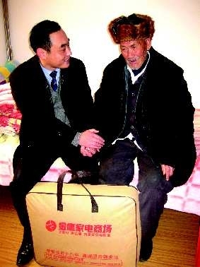 上午11时许,来到了高家店子村村民沈文柱的家中,沈文柱的老伴王玉兰瘫痪卧床15年了,一间十几平方的小屋,即使正午,屋里依然很昏暗,一张床占去了1/3的空间,没有一件像样的家具,只有两三个破旧的马扎。握着金鹰家电商场总经理温暖的双手,沈文柱禁不住涌出热泪,一个劲的说谢谢。他说以前也收到过金鹰家电商场免费送的大米,没想带今年金鹰家电商场,不仅送来了大米,还送来的被子、新春挂历、福字等新春用品,感谢社会的帮助,祝好心人过年好。