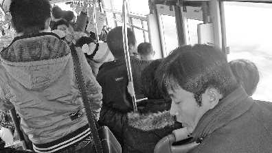 在1路车火车站站牌处,由于等车的乘客众多,每逢有一辆公交车行驶过来,蜂拥而上的乘客,立即把车门堵得水泄不通。