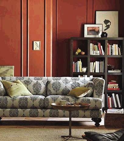 深红色客厅里,长沙发、黑色休闲椅、书架等元素,已经为客厅增加了太多“重量”。小巧的托盘茶几不仅让空间显得开阔,设计上的轻便灵巧,也让客厅减重不少。