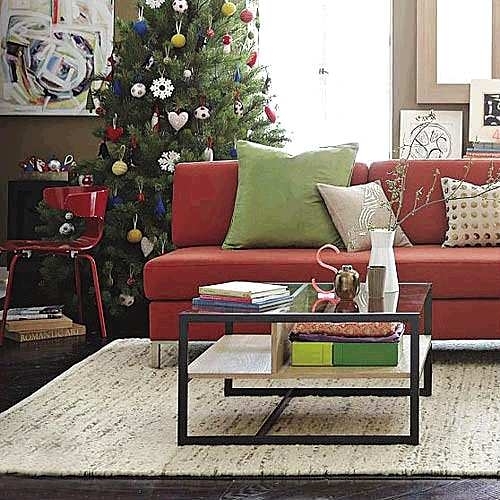 圣诞前后,客厅都会用喜庆的红色装扮,有些家庭还会摆上圣诞树装点节日的氛围。同时为了迎接节日里走访的亲友,茶几上也要常备果盘、点心盒等,用展示效果的茶几,会显得更加美观。