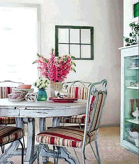 这套餐厅里的桌椅都是淘来的旧物,搭配效果却天衣无缝,很像预先设计好的。餐桌旁边的铁椅子是老旧的家具,因此没有花费额外资金。会选择用这款风琴腿的餐桌来搭配,重点在于桌腿的波浪纹样,和椅背铁艺花纹、椅子布艺的暗花隐约呼应。结果很美好,餐厅空间里,两个毫无联系的家具彼此很融洽。