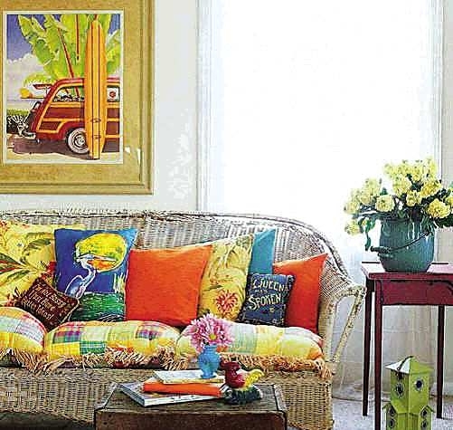 起居室中风格质朴的咖啡桌,是从旧货店里找出的竹板制成,搭配身后的彩色抱枕、触感舒适的坐垫、以及外表略显风化斑驳的藤条沙发,构成了生活的别样情趣。