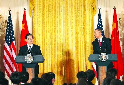 当地时间1月19日,国家主席胡锦涛同美国总统奥巴马在白宫共同会见记者。 新华社发