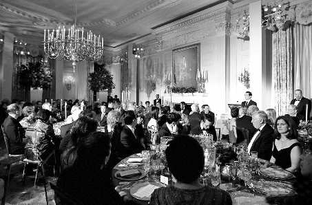 宴会在白宫内三个厅同时举行,包括国宴厅、蓝厅和红厅,吃完饭之后再到东厅欣赏表演。