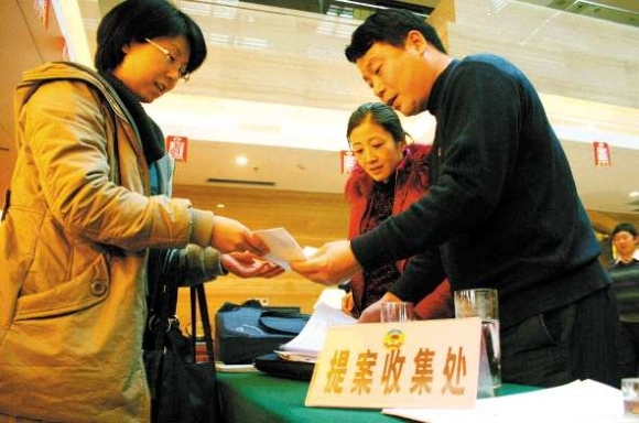 1月20日下午,参加聊城市政协十一届四次会议的政协委员陆续报到,并提交提案。图为:政协委员吴国芳(左)在提交《关于在市区红绿灯处设置倒计时秒表的建议》的提案。 本报记者 邹俊美 摄