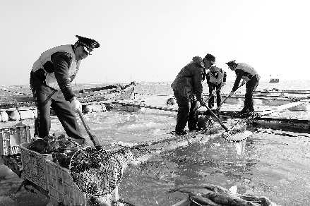 1月中旬以来,寒流加强,荣成桑沟湾海域结起了厚厚的海冰,不少网箱养殖的经济鱼类遭受严重冰冻灾害被冻死,海上渔业养殖户损失惨重。图为边防官兵在帮受灾群众打捞冻死的经济鱼类。