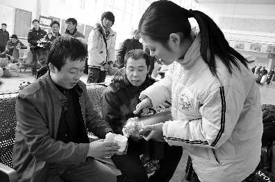 春运启动后,兖州火车站每天有一支由20名站内职工组成的青年志愿者队伍,分布到候车大厅及站台内,随时为旅客提供各项帮扶服务。图为志愿者在为候车旅客送上姜汤。本报记者 李蕊 摄