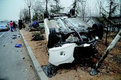 20日早上8点30分左右,记者在滨河东路河东区太平街道亭子头村路段看到,这里发生了一起交通事故,路上有一段约10米长的刹车痕迹,路边一棵树被一辆小汽车顶歪,车子已经四轮朝天,前车头损坏严重,路面上还散落着很多车上的碎片。附近一辆三轮车被撞翻,还掉了一个车轮。