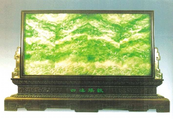 在北京玉器厂耗用镂年时间制作的四件翡翠国宝中,四号料制成的翡翠插屏《四海欢腾》被认为是当代中国玉浮雕的巅峰之作。