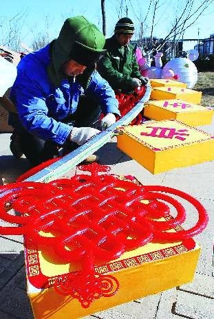 23日上午10时许,记者在清风湖公园看到,许多元宵花灯已陆续搭建完成。正在搭建花灯的工作人员介绍,从大年初三开始,元宵花灯将与市民见面,“今年新增了一些元素,比如海宝、中国馆等,相信市民会喜欢的。”