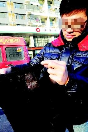 右图:跳车时鲁先生穿的衣服被刀捅破。