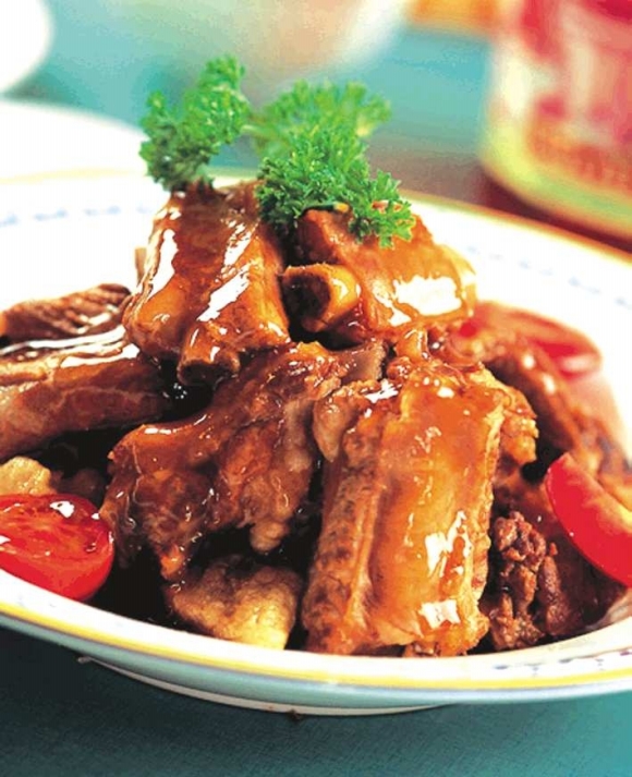具体做法:将猪排斩成约1寸长的小块,用绍酒20克和盐拌匀,再用适量生粉、面粉和水适量搅拌均匀。将酱油、糖、醋和绍酒菜5克,生粉水加水调成汁备用。烧热锅,下油,至六成熟时,把猪排逐块放入油锅炸至结壳捞出,拨开粘连,捡去碎末,油温升至七成时,再将排骨下锅复炸至外壳松脆捞出。原锅留油少许,放入葱段爆香后捞出,即将排骨下锅,迅速将调好的芡汁放入锅中,连续翻炒,淋下香油即可。
