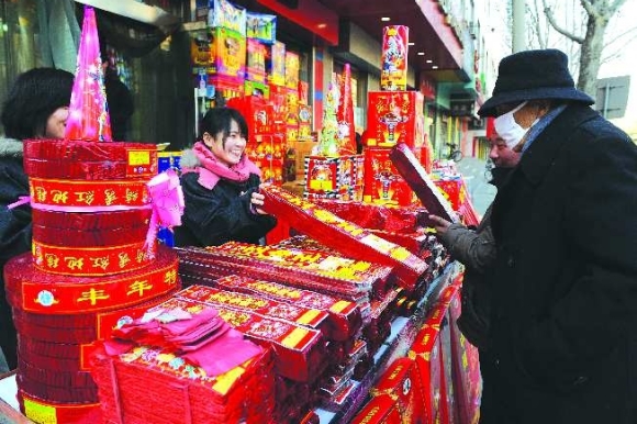 1月24日,济南市燕子山路,一个鞭炮摊点在向顾客推销过年的鞭炮。当天,济南市限放区内迎新春鞭炮开卖第一天,尽管成交量不大,但摊主并不紧张:好生意得到腊月二十五六才开始呢。 本报记者 周青先 摄