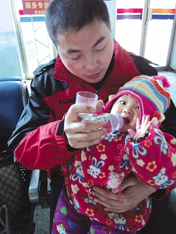 小女孩的爸爸李海群告诉记者,孩子名叫李安欣,七个月大了。他们要坐由哈尔滨到合肥的火车,然后再转车回江西九江老家过年。“孩子比较怕生,看到很多陌生人就会哭闹不停,但是只要一听见音乐,她就会很兴奋,冲谁都笑嘻嘻的。”孩子的妈妈告诉记者,一次一位乘客用手机放音乐,女儿两眼就直溜溜地盯着人家的手机,手脚也跟着音乐的节奏不停地动来动去。后来人家那位乘客下车了,没了音乐女儿就开始哭闹起来。她就把手机上几首原来储存的歌放给女儿听,就这样撑了一路。