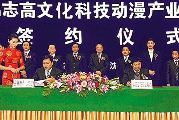1月23日,辽宁省盘锦市政府与志高实业集团在沈阳举行志高文化科技动漫产业园项目签约仪式。图为志高实业集团董事局主席江东廷(右)与盘锦市政府代表签约。本报通讯员 雷陈杰 摄
