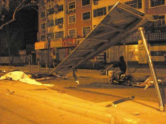 24日晚11时20分,记者在事发现场看到,一辆银白色轿车翻扣在非机动车道上,附近一个公交亭被这辆轿车撞得支离破碎。这辆银灰色轿车前脸损坏严重,车前挡风玻璃和前车门处的玻璃都出现裂痕,车顶没有明显受损。