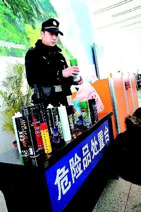 下午14时30分,入站客流高峰期到来,仅仅五分钟就检查出三四件危险品。据记者了解,一个安检员一个班就能检查出数十件危险品,主要是发胶、压力罐、打火机。