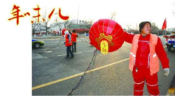 1月26日下午,市政工作人员正在府前大街把彩灯、大红灯笼挂上街头,迎接新春佳节的到来。据了解,府前大街东三路至金水桥一段也将在春节前挂上红彤彤的灯笼。