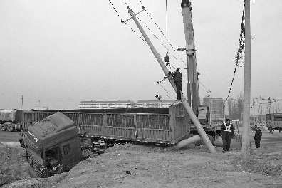 26日12时,记者在事发现场看到,空货车的车头栽进了路边沟里,和车身分离。左侧车门开着,玻璃、碎片散落一地。货车还撞断了路边的一根电线杆。受电线杆影响,事发地周围部分居民家断电,一名电工正在抢修电路,两辆事故抢险车正在处理现场。据围观者曹先生说,当时货车自西向东行驶,车速较快,眼看就要到信号灯了,货车没有刹住车,撞上了路边同向行走的两名年轻人,司机猛打方向盘,又撞上了路边电线杆,一头栽进了沟里。